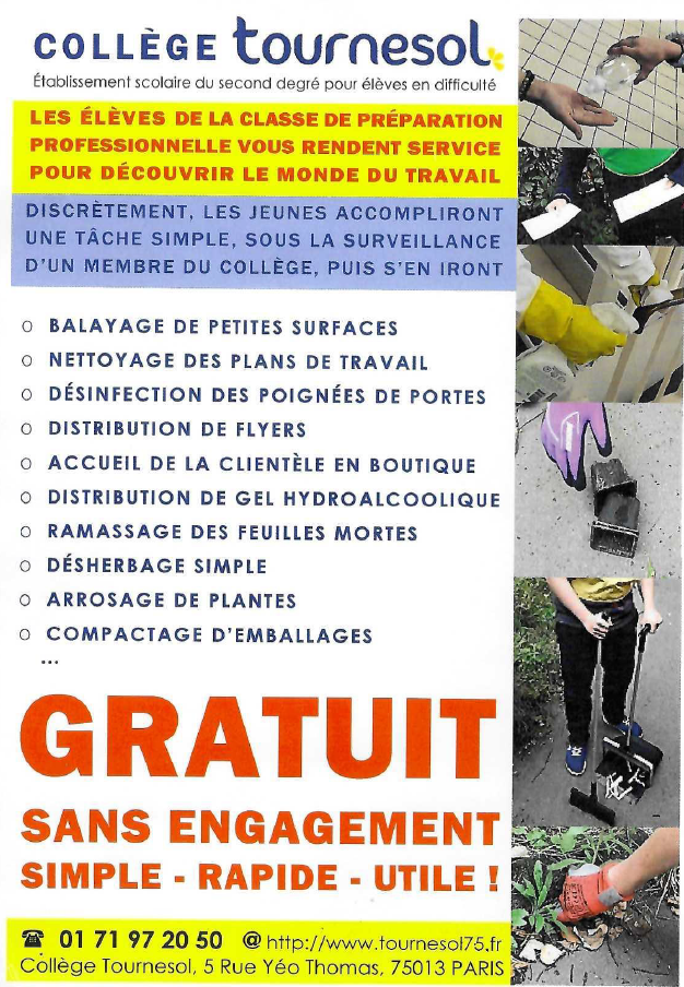 - Les élèves de Tournesol se déplacent dans des entreprises ou ateliers et peuvent faire des actions avec Tournesol Service